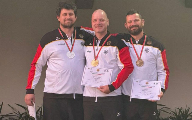 Diesmal sollte es für Patrick noch erfolgreicher werden. In der ersten Disziplin mit einer originalen Perkussionspistole aus dem Jahr 1851 wurde er Zweiter, ringgleich mit dem erstplatzierten Briten, der jedoch aufgrund seiner höheren Anzahl von Zehnern vor ihm gewertet wurde. Gold gab es aber dann in der Mannschaftswertung für das deutsche Team mit Patrick.