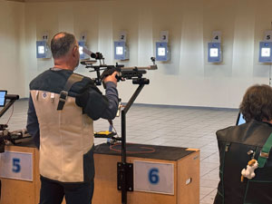 Beim Aufeinandertreffen der beiden Gruppenbesten, dem SSV Tüschenbroich und dem Brühler Schießklub ging es schon um eine Art Vorentscheidung, wer am Ende die besten Karten für einen sicheren Relegationsplatz in der Hand hält. Auf der Schießanlage der Sportschützen Köln-Stammheim war beim Eintreffen der Kontrahenten bereits viel Betrieb. Die Kölner hatten die Oberligakämpfe der Freihand- und der Aufgelegt Schützen auf diesen Tag zusammengelegt. Der Zuschauerraum war infolgedessen bereits fast bis auf den letzten Platz gefüllt. Entsprechend laut war die Kulisse, welche die Aktiven an den Ständen tunlichst ausblenden mussten. Während der 15-minütigen Probezeit stellte der „Stadionsprecher“ Reiner Lützkirchen die Wettkämpfer einzeln vor und gab dann das Startzeichen für die dreißigminütige Wettkampfphase. Glücklicherweise hatte unser Paul Czerwinski in letzter Minute sein Kommen zugesichert, weshalb wir gegen die leicht geschwächten Tüschenbroicher mit voller Kapelle antreten konnten. Wie würde sich die seit dem letzten Wettkampf veränderte Startaufstellung mit Paul auf eins, Werner Blischke auf zwei und Helmut Netzer auf drei auf den Ausgang des Wettkampfs auswirken?